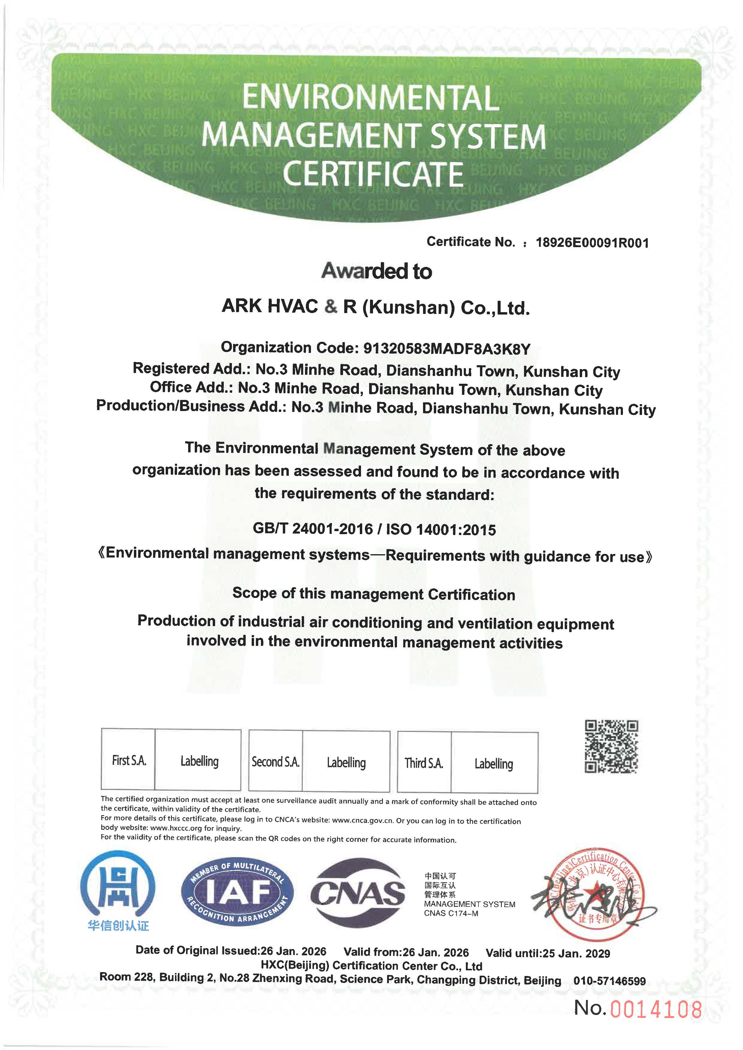 ISO 14001 Environmental Management System Certification Certificate ARK HVAC & R (Kunshan)
