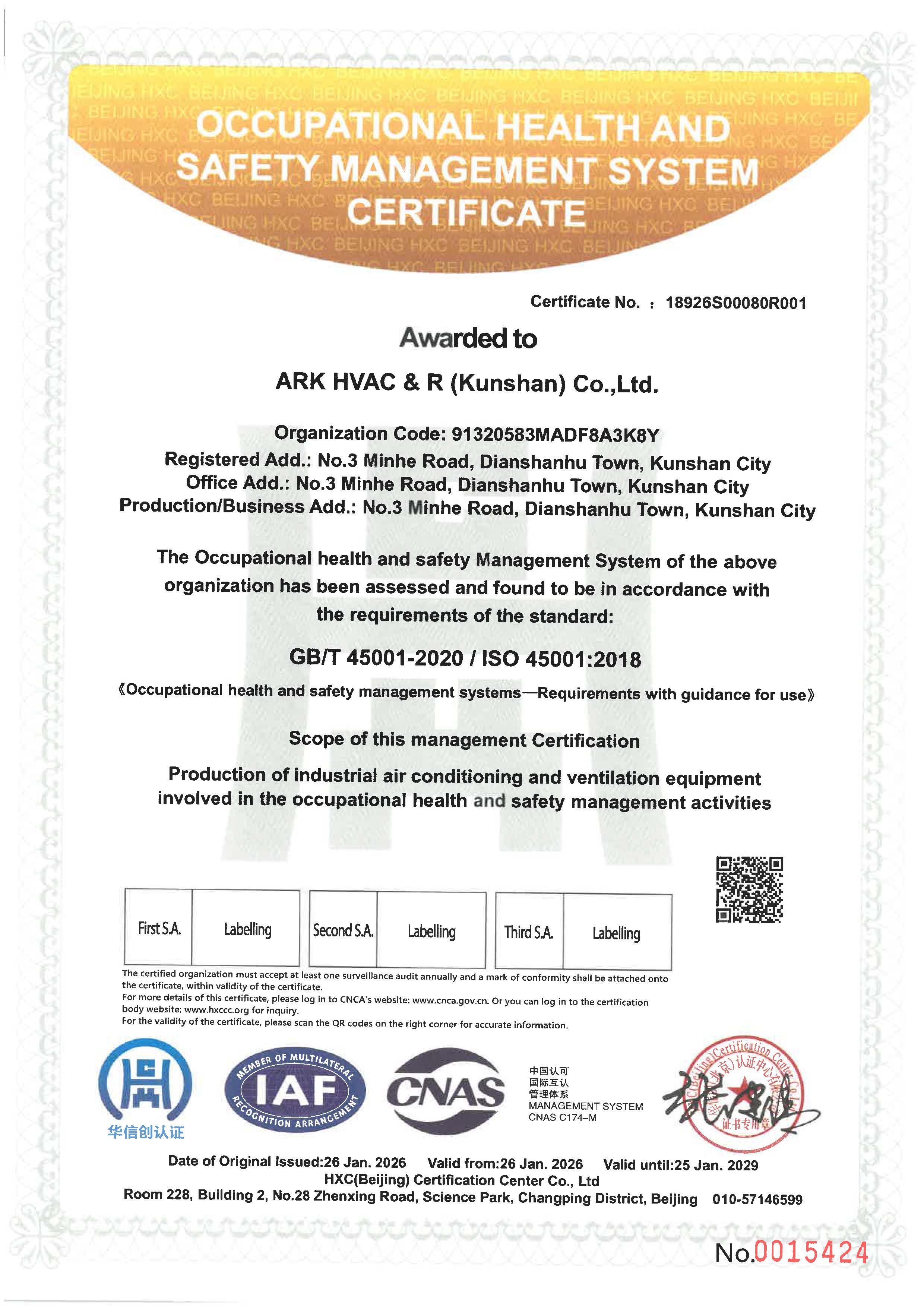 ISO 45001 Occupational Health and Safety Management System Certification Certificate ARK HVAC & R (Kunshan)